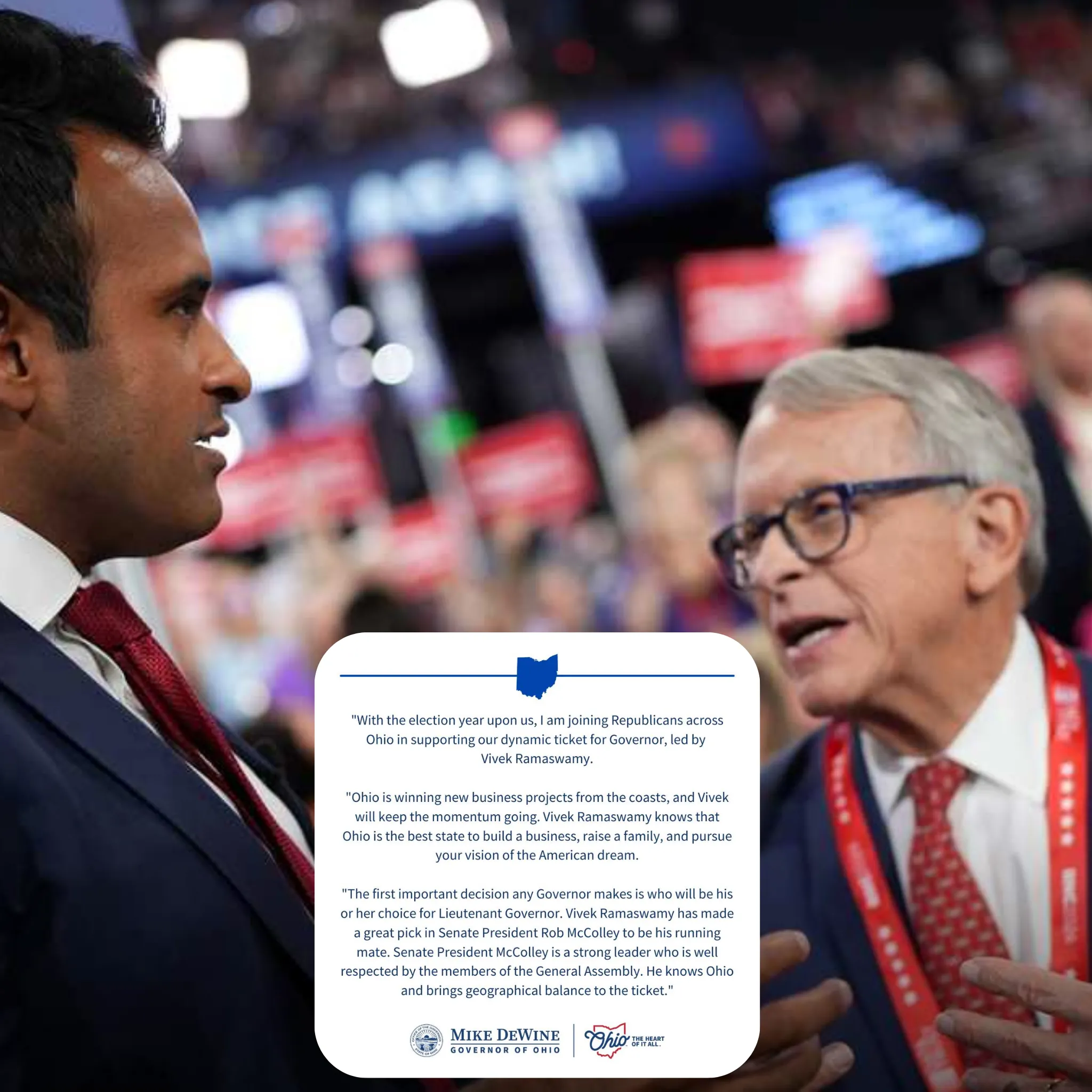Governor Mike DeWine’s endorsement of Vivek Ramaswamy for Governor of Ohio marks one of the most consequential political moments in the state’s recent history. Announced publicly through a formal statement, the endorsement does more than back a candidate—it signals a strategic shift within Ohio’s Republican leadership and underscores the growing influence of a new generation of conservative leadership.