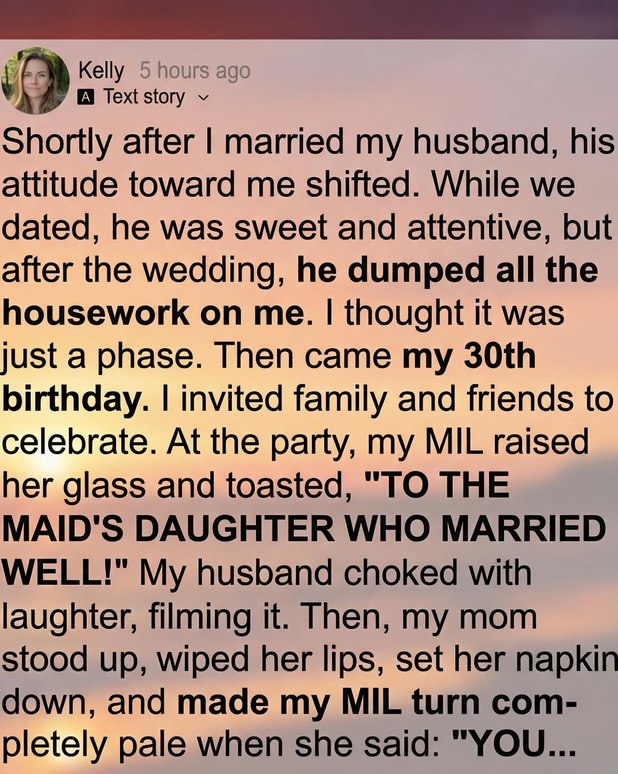 My mother-in-law raised her glass and, with a smile that didn’t reach her eyes, toasted, “To the maid’s daughter who married well!” A few guests laughed—my husband included, who even recorded it on his phone. The words hit like a stone. Heavy. Humiliating.