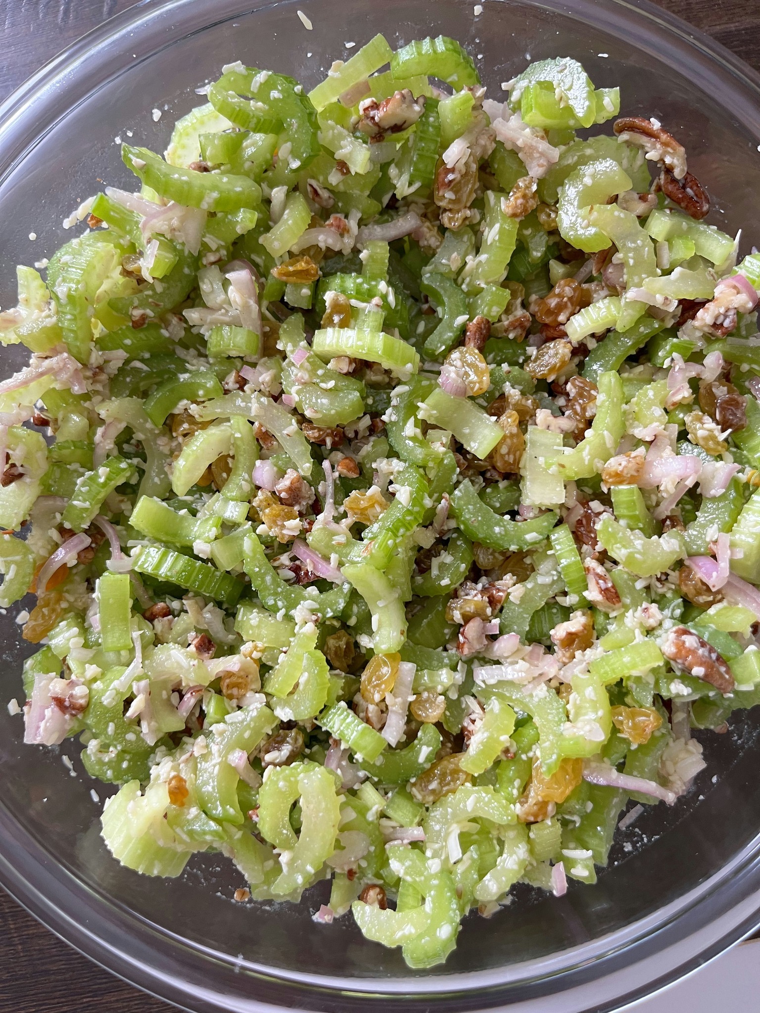 A crisp, refreshing salad where the earthy crunch of celery and pecans meets the sweet pop of raisins and the sharp, salty kick of parmesan. A simple honey-lemon vinaigrette ties it all together.